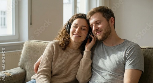 Private moment. At home, a couple enjoying music with headphones on. The atmosphere is relaxed and positive.
