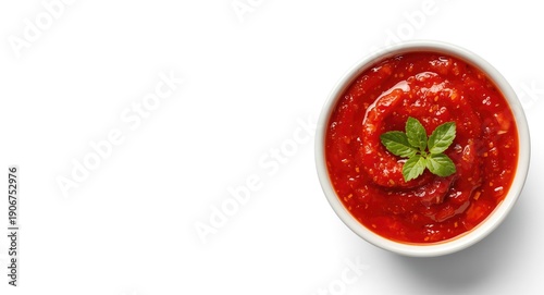 Georgian adjika spicy red sauce displayed with copy space on white background