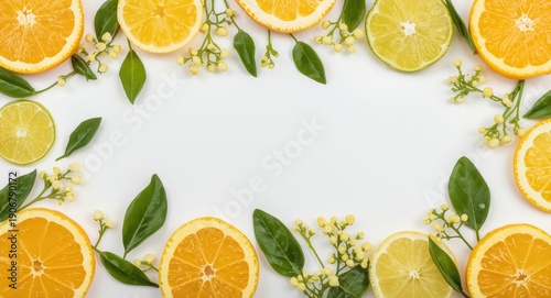 Citrus fruit segments leaves and flower buds arranged as flat lay on white backdrop copy space