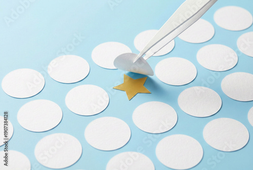 Tweezers revealing a gold star hidden under white paper circles as a concept of talent search or uniqueness