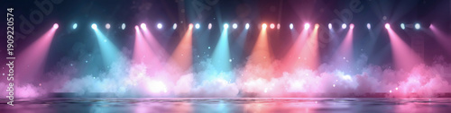 K-pop stage background with colorful celebration light haze and vibrant neon glow, minimal concert atmosphere