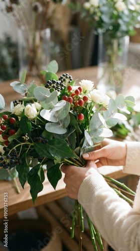 Woman in cream sweater holds a bouquet of flowers with eucalyptus, red berries, and white roses, surrounded by floral arrangements and greenery in a bright indoor setting