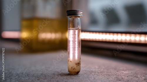 A cloudy test tube sample with sediment rests on a textured surface under laboratory lighting