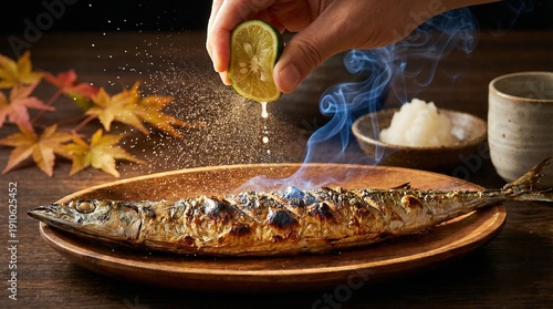 Squeezing citrus onto grilled pacific saury(焼き上がった秋刀魚にスダチを搾る)