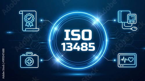 ISO 13485 acronym, medical devices management system, international standard that specifies the design, development, production, installation, and servicing of medical device. new