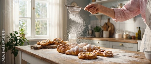 Cinematic ultrawide panorama of a person sprinkling powdered sugar over fresh croissants and danish pastries on a rustic wooden table in a bright, sunlit kitchen with a cozy morning atmosphere.