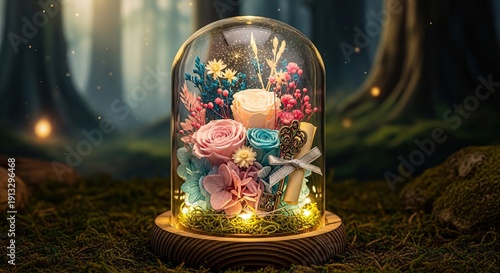 Enchanting preserved flower arrangement glows magically within a glass dome in a mystical forest setting.