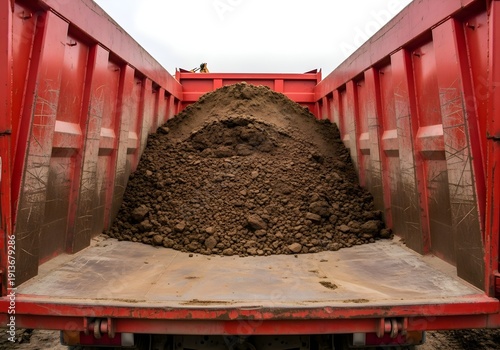 Industrial Earth Transport: Large red dump truck bed filled with pile of soil and dirt, construction materials, landscaping and site preparation concept