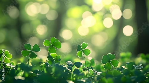 Bright green clovers glow magically in a sunlit forest scene