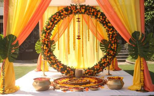 Vibrant Haldi Ceremony Decor with Marigold Floral Arch, Yellow and Orange Drapes, Tropical Green Leaves, Brass Pots and Urli Bowls with Rose Petals in Sunlit Festive Setting
