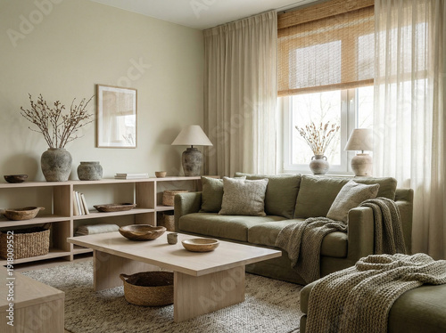Salon w stylu Japandi. Niskie meble z jasnego jesionu. Ściany w kolorze bardzo jasnego khaki. Sofa w odcieniu oliwkowym z lnianą teksturą. Bambusowe dodatki, kamienne wazy, japońska estetyka wabi-sabi