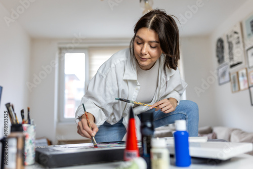 Creative female artist painting in her light-filled home studio, focused young woman using a palette and brush on canvas, authentic artist lifestyle, hobby and small business concept at home.