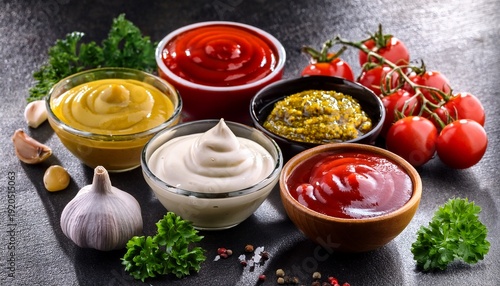 sauces ketchup mustard mayonnaise dips spices herbs tomatoes garlic pepper salt food culinary gourmet fresh
