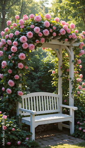 White wooden garden arbor bench covered in climbing pink roses situated in a lush garden