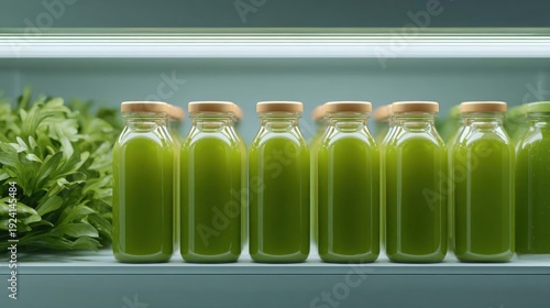 Row of six glass bottles with wooden lids lined up on a white shelf. the bottles are filled with a green liquid, which appears to be a smoothie or juice.