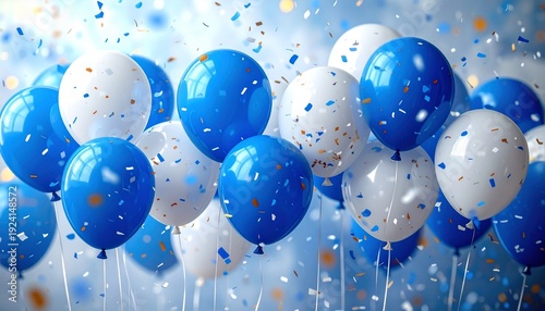 Blue and White Balloon Celebration with Confetti Festive Event Decor for Party Birthday Joyful Occasion Backdrop.