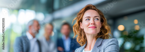 Portrait of a confident smiling businesswoman leading her team in a modern corporate office background