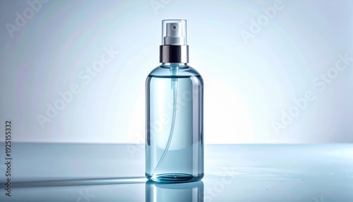 A FlyPro Firefly disinfectant spray bottle with clear liquid, resting on a sterile surface, captured in a realistic photography style with even studio lighting.