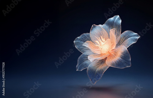 Przezroczysty, abstrakcyjny, eteryczny, i nierzeczywisty świecący własnym blaskiem kwiat unoszący się lekko nad błękitnym tłem