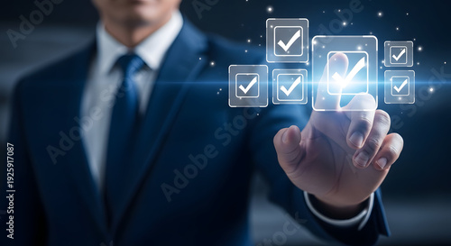 Businessman interacting with digital checklist interface