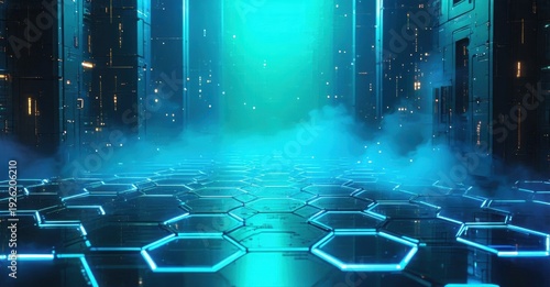 Futuristic corridor glows with vibrant blue light. Hexagonal floor patterns lead toward distant bright source, obscured by mist. Digital aesthetic dominates scene.