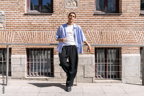 Young man in casual streetwear leaning on a railing by a brick building, exuding modern urban style, confidence and youth culture
