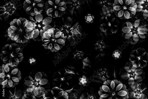 Czarno-białe tło z suszonych wiosennych kwiatów, kompozycja botaniczna z pierwiosnków