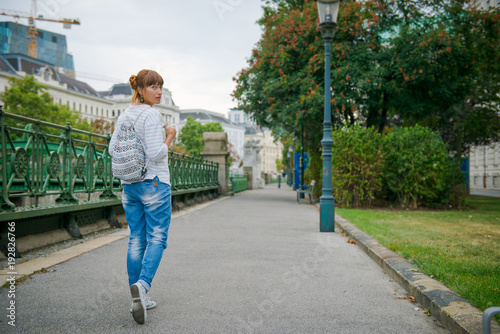girl tourist walking around the city. Free travel. young woman with a fun hairstyle travels alone with a backpack. Guided tour of Vienna. Concept of freedom, recreation. girl in jeans and sweater