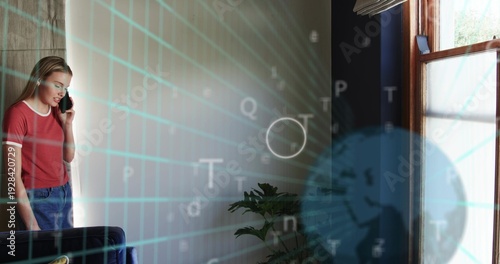 Standing woman holding smartphone, speaking in living room in red tee, digital overlay, copy space
