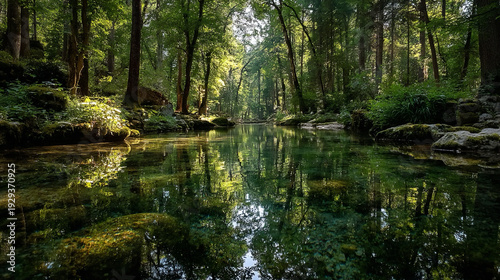 Forest stream reflection, calm water mirroring surrounding trees, textured surface, sunlight enhancing patterns, emphasizing tranquil woodland ecosystem and natural landscape.