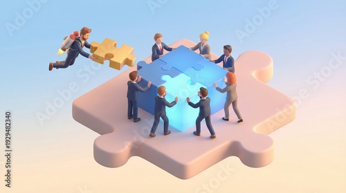 Diverse team of professionals collaborates to fit oversized puzzle pieces together on a large puzzle platform, symbolizing teamwork, problem solving, and strategic alignment