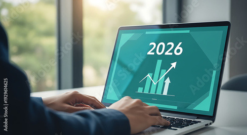 Business professional analyzes financial growth projections for 2026 on a laptop, indicating future success and strategic planning
