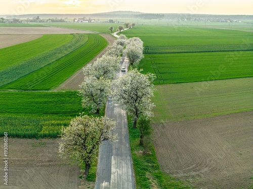 Widok z góry na wiejską drogę otoczoną kwitnącymi na biało drzewami owocowymi. Malowniczy krajobraz pól uprawnych wiosną, ukazujący harmonię rolnictwa i natury w rzucie z lotu ptaka (drona).