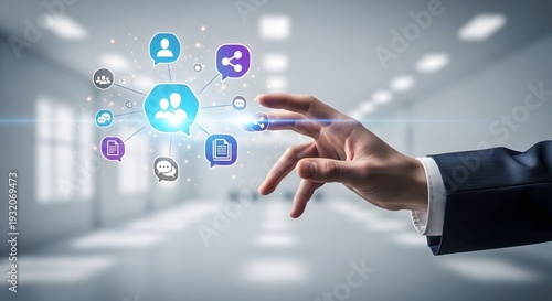 Digital networking connection and communication concept with person interacting with social media icons in a modern office