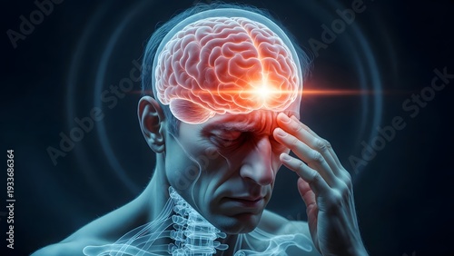 Frontal lobe headache and sinus pressure pain. Medical diagnosis and chronic migraine. Man touching forehead with glowing light effect on the prefrontal cortex