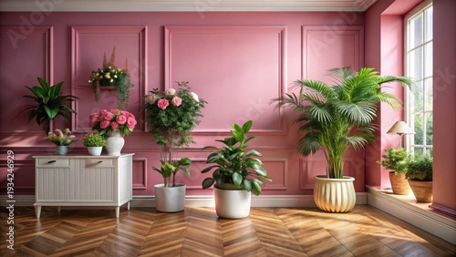 A sunlit interior scene featuring an array of potted plants, vibrant flowers, and a white cabinet against a blush pink wall with paneled molding, all situated on a herringbone hardwood floor.