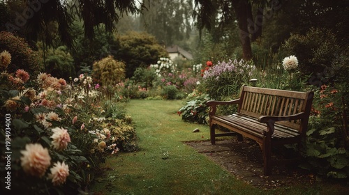Spring season, garden, flower, fresh, life. A wooden bench situated in the middle of a lush garden, surrounded by a variety of flowers in pink, white, red, yellow, and green.