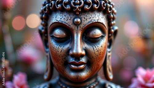 A decorative Buddha statue with a serene expression, situated outdoors in what appears to be a garden setting