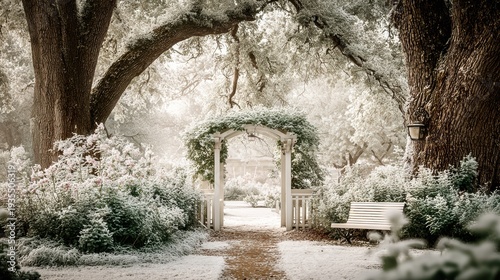 Spring snow ice thaw, end of Winter Season, hope, fresh start. A serene winter garden with a bench situated in the middle of a snowy path surrounded by lush plants and trees.