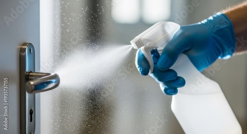 Hand in blue glove spraying disinfectant on door handle for hygiene and cleanliness