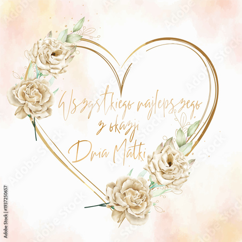 Kartka lub baner z życzeniami z okazji Dnia Matki, w kolorze złotym, wewnątrz złotego serca z beżowymi i kremowymi kwiatami na beżowo-różowym tle akwarelowym.
