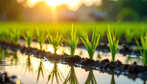 水面に反射する光の中に整然と並んだ稲の苗のクローズアップ
