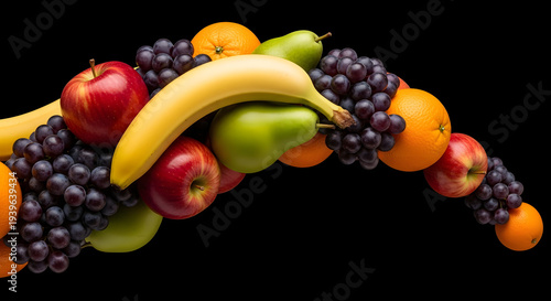 Floating Fruit Arch Composition with Banana, Apple, Grapes, and Orange