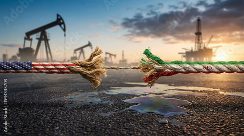Rope with American and Iranian flags frayed at the center, oil rigs in the background, sunset over, concept of oil politics, economic sanctions, resource control, Middle East conflict, space for text