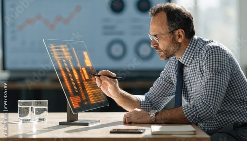 Banker assessing AIgenerated personal loan risk scores on a touchscreen dashboard with traditional credit data softly blurred in the backdrop.