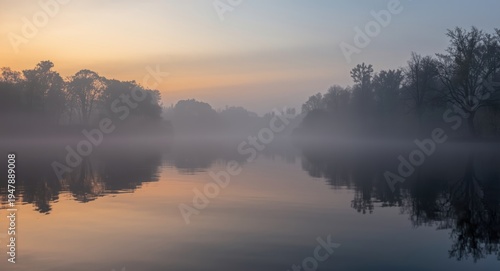 Calm water river landscape at dawn with misty fog and quiet tree reflections