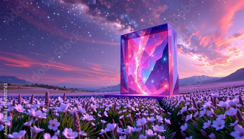 The image features a striking, futuristic structure resembling a large, transparent crystal or glass cube situated in a vast field of blooming flowers