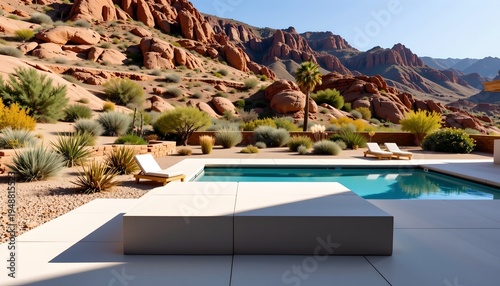 The image features a modern outdoor swimming pool situated in a desert landscape with reddish rock formations and rugged mountains in the background