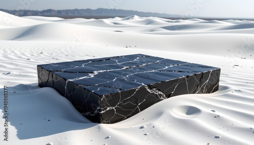 The image features a large, rectangular black stone block with prominent white veining, situated on a vast expanse of white sand dunes