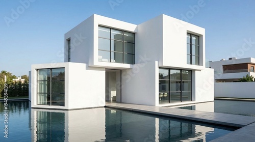 A minimalist white modern luxury villa with large glass windows situated by a calm reflective pool